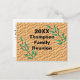 Créez une invitation de faire-part peu coûteuse pour votre prochaine réunion de famille avec ces cartes postales uniques. L'année et le nom de votre famille apparaissent au centre de cet autocollant rond. Le texte est entouré de branches d'arbres avec des feuilles vert vif. L'arrière - plan brun ressemble à un panier tissé ou un motif de terre fêlé. L'arrière de cette carte postale bon marché offre beaucoup d'espace pour ajouter vos informations sur l'événement. Tout le texte peut être personnalisé rapidement et facilement.