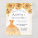 Une invitation moderne, élégante et glamour pour une Quinceañera, fête d'anniversaire des 15 ans. Un fond blanc avec de la poussière de glitter doré, une robe dorée et des roses, des fleurs. Le nom est écrit avec un style de lettrage manuscrit moderne. Personnalisez et ajoutez les détails de votre fête.