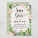 Invitation de sauvegarde de date de fiesta rustique avec des succulentes aquarelles, des roses roses et des lettrages calligraphiques modernes.