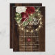 Style champêtre chic, faux éclairage, fleurs ornées de twig wreath avec riche, blanc cassé et rouge foncé à bordeaux luxuriants floraux luxueux "Thé nuptial" conception sur un arrière - plan en faux bois teinté foncé. Ce design composite boisé rustique de Holiday Hearts Designs (droits réservés).