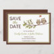 Cartes d'invitation de sauvegarde de date fantaisistes avec deux chouettes mignonnes assises sur une branche avec un cœur dans une bulle au-dessus d'elles. Bordure marron et verte sur un fond blanc. Personnalisé avec vos informations dans l'espace fourni. Procurez-vous les tampons de sauvegarde de date de chouette assortis ci-dessous :