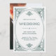 Ces invitations de mariage séduisantes présentent une touche moderne d'art déco classique. Un cadre géométrique et ornementé et festif vert orné décorent un élégant arrière - plan blanc/argent très clair pour un look mariage des années 1920 spectaculaire, glamour et vintage, qui est parfait pour votre mariage de Noël. Ta photo va à l'arrière.
