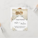 Cette élégante invitation de mariage propose un texte de calligraphie à trait cursif avec une décoration florale moderne et une superposition de photo sur le dos d'un fond à deux anneaux d'or.