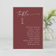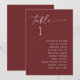 This table seating chart keeps guest placement simple and easy to follow. The design combines a clear table number with a neatly arranged guest list, so guests can quickly find their seat without confusion. The script heading adds a bit of personality, while the rest of the layout stays clean and structured. The deep wine red background gives the card a richer, more refined look, making it especially suited for evening receptions or weddings with deeper color palettes. Pairs naturally with modern elegant, classic, minimalist, and romantic wedding styles, and fits beautifully into fall and winter weddings, as well as more formal late summer events. Available as both a printed card and a digital download.