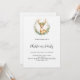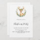 Un élégant arrière - plan blanc. Décoré d'une couronne de pin vert et d'un cerf mignon. Fête de Noël écrite avec un script de style à grande main moderne et tendance. Personnalisez et ajoutez les informations de votre parti.