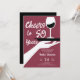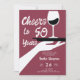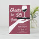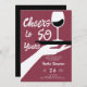 Un élégant mais décontracté modèle d'invitation à la fête du 50e anniversaire pour les femmes avec un thème de dégustation de vin, avec une illustration rétro d'inspiration vintage d'une main tenant un plateau avec un verre de vin et le titre "Cheers to 50 Years" dans un script moderne ludique. Invitation de 50 ans classe mais décontractée pour une femme à l'occasion de son cinquantième anniversaire célébrant avec une fête du vin, dans une cave ou un restaurant, bistrot... Couleurs noir et blanc et rouge bordeaux poussiéreux.