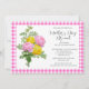 Célébrez les mamans de votre famille avec un déjeuner de fête des mères. Ce joli carton d'invitation présente une bordure à carreaux rose et blanc avec des roses jaunes et roses. Personnalisez le texte avec vos informations de vacances.