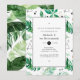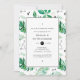 Invitation à déjeuner branchée pour femmes d'honneur avec des feuilles de plage tropicaux verts et une motif géométrique en noir et blanc.