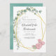 Décor vert eucalyptus géométrique tendance et roses roses rose rousse bridesservantes invitation déjeuner avec cadre géométrique or et lave à l'aquarelle menthe inverse.