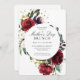 Célébrez maman avec cette invitation unique de déjeuner pour la fête des mères à l'aquarelle florale. Il a un beau cadre floral circulaire avec des bouquets de roses dans la combinaison de couleurs élégante de rouge bordeaux, blanc, violet prune avec de la verdure éparpillée partout. Personnalisez le modèle de texte avec les informations de votre événement. Cette invitation est disponible à la fois comme invitation imprimée ou téléchargement numérique à envoyer électroniquement à vos invités.