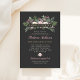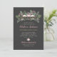 Notre vintage boho fleuri mariage nuptiale invitation dans un format vertical comprend un arrangement floral moody des roses romantiques, des fleurs de pivoine et d'anémone, de la verdure, et des accents bohème rustique de plume dans des tons riches de rose, rose mauve, cassis, blanc crémeux, vert mousse, gris et or sur une couleur gris foncé / noir arrière - plan. Une palette de couleurs dramatique et rêveuse pour votre mariage d'automne ou d'hiver. Personnalisez le beau texte personnalisé pour votre événement rustique de douche nuptiale élégant.