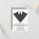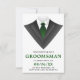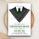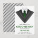 Invitez vos garçons d'honneur avec cette carte de demande moderne présentant un smoking classique avec une cravate verte sur fond blanc. Ajoutez simplement les détails de votre événement sur ce modèle facile à utiliser pour en faire une invitation unique. Retournez la carte pour révéler un motif rayé noir et blanc au dos de la carte.