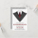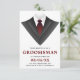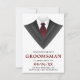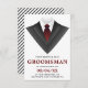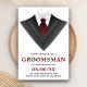 Invitez vos garçons d'honneur avec cette carte de demande moderne représentant un smoking classique avec une cravate rouge sur fond blanc. Ajoutez simplement vos détails d'événement sur ce modèle facile à utiliser pour en faire une invitation unique. Retournez la carte pour révéler un motif de rayures noires et blanches au dos de la carte.
