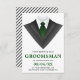 Invitation vos groomsmen avec cette carte de demande moderne avec un tuxedo classique avec une cravate verte contre un arrière - plan blanc. Ajoutez simplement les détails de votre événement sur ce modèle facile à utiliser pour en faire une invitation unique. Retournez la carte pour révéler un motif rayé noir et blanc au dos de la carte.