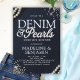 Une invitation à la douche pour couple denim, diamants et perles, moderne, élégant et chic, avec un thème denim et diamants et perles. Il présente un arrière - plan denim, des strass élégants et des perles (ce sont des effets numériques, pas de vraies pierres ou perles !) des lettres personnalisées pour le mot "denim" et la typographie en blanc. Une invitation wedding shower chic "denim et diamants et perles" pour un couple moderne qui aime le denim.
