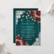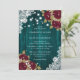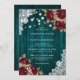 Elégante invitation de mariage turquoise et bordeaux personnalisée, avec roses bordeaux et bébé souffle sur un arrière - plan en bois de grange orné de dentelle fleurie et de lampes à cordes. Un design de carte parfait pour inviter vos invités à votre fête de mariage bordeaux et turquoise. Objets assortis disponibles pour compléter ces invitations de mariage turquoise et bordeaux rustiques.