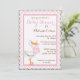 Invitation de baby shower avec une cigogne mignonne de bande dessinée tenant un bébé dans un paquet rose sur un point de polka et un arrière - plan roses et blancs de dentelle d'oeillet.
