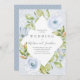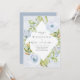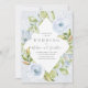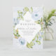 Une élégante invitation de mariage vintage avec un délicat arrangement bleu de fleurs et de vignes dans un motif géométrique diamant frappant. La bordure a un délicat motif en dentelle blanche sur un arrière - plan bleu poussiéreux. Le dos de la carte est conçu avec un motif diamant pour se coordonner avec l'avant.