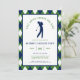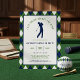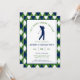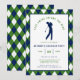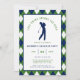 Célébrez le futur marié avec une journée sur les links ! Cette invitation de l'enterrement de vie de garçon sur le thème du golf présente une bordure à motif argyle classique bleu marine, vert et blanc qui capture parfaitement l'esthétique du country-club. Le centre affiche une silhouette épurée d'un golfeur en plein swing, associée au titre "Dernier swing avant la bague". Ce modèle est entièrement personnalisable, vous permettant de mettre à jour facilement le nom, la date, l'heure de départ et les détails du lieu. Que vous prévoyiez 18 trous ou un après-midi décontracté au practice de golf, cette invitation chic et professionnelle donne le ton pour une célébration sophistiquée.