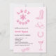Un arrière - plan rose vif. Décoré avec des icônes de fille de vache rose. Personnalisez et ajoutez le nom de la mariée à être et les détails du parti. Texte : Dernier Rodeo. Retour : itinéraire du week-end