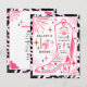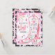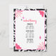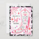 Invitation de fête d'enterrement de vie de célibataire sur le thème de la dernière cowgirl disco avec illustration d'une botte de cowgirl avec franges, rose, éclair, cœurs et étoiles avec un schéma de couleurs rouge, rose et noir. La bordure est imprimée vache. Le verso comporte l'itinéraire.