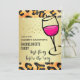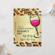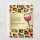 Invitation de fête pour une soirée bachelorette avec un motif empreinte de léopard animal sauvage. Un cool regardant du verre à vin sur le côté, dessiné avec un contour d'encre noire épaisse et rempli de vin rose chaud. Cadre dégradé or.