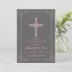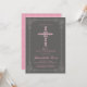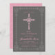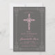 Cette première invitation de communion sainte, élégante et classique, présente une croix dessinée de rose et de blanc avec une bordure détaillée assortie. Parfait pour l'occasion religieuse spéciale de votre fille, le texte et la couleur arrière - plan peuvent être customisés à votre goût.