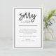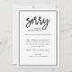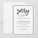 Cette annonce simple et élégante, noire et blanche est un moyen de s'excuser auprès des clients ou des amis lorsque vous devez annuler, reprogrammer ou reporter un événement ou un mariage. L'écriture manuscrite noire moderne ajoute une touche stylée, tandis que le cadre noir rectangulaire ajoute un look formel et classique. Utilisez ces cartes d'annonce pour toute annulation, report ou reprogrammation.