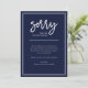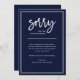 Cette annonce simple et élégante de couleur bleu marine est un moyen de s'excuser auprès des clients ou des amis lorsque vous devez annuler, reprogrammer ou reporter un événement ou un mariage. Un script manuscrit blanc moderne ajoute une touche stylée, tandis que le cadre rectangulaire ajoute un look formel et classique. Utilisez ces cartes d'annonce pour toute annulation, report ou reprogrammation.