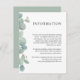 Une belle bordure de verdure d'eucalyptus à l'aquarelle met en valeur cette carte d'informations de mariage moderne utilisée pour fournir à vos invités de mariage des détails, des informations sur les hôtels, votre site web de mariage ou d'autres informations utiles concernant votre mariage. Personnalisez le texte d'exemple indiqué dans le modèle de texte avec vos informations souhaitées. Ces cartes peuvent être envoyées en pièce jointe avec vos invitations de mariage. Une gamme de produits de papeterie assortis est disponible dans ce design pour coordonner votre mariage ou événement avec un beau style.