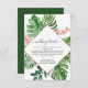 Cartes de détails de mariage de printemps ou d'été avec feuilles de palmiers verts tropicaux et fleurs roses blush à l'aquarelle avec faux or rose géométrique - comprend une belle et élégante typographie script avec des fleurs botaniques tropicales modernes et de la verdure pour la célébration spéciale du jour du mariage.