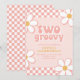 Invitation rétro pour un 2ème anniversaire inspirée des années 70 avec des polices, des marguerites et un motif à carreaux dans le style des années 70.
