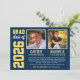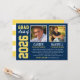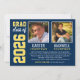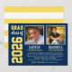 Annoncez vos deux diplômés du lycée de la promotion 2022 avec style grâce à cette invitation à une fête de remise de diplômes. La carte recto-verso est conçue pour deux diplômés et présente leurs photos avec un design simple et masculin avec une typographie inspirée des maillots de sport. Les couleurs bleu marine, jaune et blanc peuvent être personnalisées pour correspondre aux couleurs de votre école. Un motif de bandes blanches habille le dos de la carte.