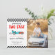 Carte d'invitation photo de 2e anniversaire de la belle voiture de course thème enfant avec illustration d'une voiture vintage bleue avec flammes. Le texte dit "grandir deux vite."