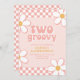 Invitation rétro pour un 2ème anniversaire inspirée des années 70 avec des polices, des marguerites et un motif à carreaux.