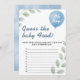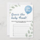 Devinez Le Jeu De Douche Alimentaire Bébé | Balloon Eucalyptus Greenery Baby Boy Game Cards Préparez-vous pour un défi amusant et savoureux avec notre Guess The Baby Food Shower Game Balloon Eucalyptus! Ces cartes de jeu attrayantes présentent une végétation luxuriante d'eucalyptus et de joyeux ballons bleus, créant un cadre délicieux pour cette activité de baby shower classique. C'est la meilleure façon d'ajouter des rires et un plaisir sensoriel unique à votre célébration, alors que les invités essaient d'identifier différentes saveurs de nourriture pour bébés! Ceci suppose que le jeu de nourriture pour bébés est idéal pour les hôtes à la recherche d'une activité interactive et humoristique qui plaît à tous. L'eucalyptus doux et la conception de ballon bleu en font un ajustement polyvalent pour différents thèmes de douche bébé garçon, de la botanique moderne à l'élégance rustique. Les clients pourront renifler et goûter (s'ils osent !) les différentes purées de nourriture pour bébés, ce qui provoquera des réactions amusantes et des moments mémorables. Personnalisez facilement ces cartes de jeu pour bébé verdoyantes avec vos noms, la date de la douche, et toutes les instructions spécifiques pour le jeu. Vous pouvez personnaliser les polices et le placement de texte pour qu'elles correspondent parfaitement à votre vision de célébration unique. Imprimées sur des cartons de haute qualité, ces cartes de jeu sont conçues pour être un complément magnifique et fonctionnel à vos activités de baby shower, avec espace pour les invités à écrire leurs devis. devinez le jeu de nourriture pour bébé, jeu d'eucalyptus, jeu de nourriture pour bébé verdoyant, jeu de baby shower d'eucalyptus, jeu de baby shower pour bébé bleu, jeu de nourriture pour baby showers, défi alimentaire