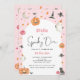 C'est une fête d'anniversaire "Éffrayante" - super mignonne rose 1er Boo-day Invitation avec un design d'arc. Un invitation d'halloween spooktaculaire pour votre fête de premier anniversaire de petite fille. Rose, orange, noir et blanc avec d'adorables jack-o-lanternes, fantômes heureux avec des casquettes de fête, casquette sorcier, chat noir, citrouilles roses, chauves-souris, araignées et maïs-bonbons. Personnalisez avec votre nom Enfants et les détails de la fête.