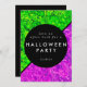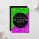 Une invitation moderne pour une fête d'Halloween. Cette conception comprend un motif à pitume vert acide dans une large bande diagonale sur un côté avec un motif à pitume violet magenta dans l'autre coin, divisé par une ligne noire. Au centre, il y a un grand cercle noir avec de l'espace pour les détails de votre fête dans une police blanche moderne. Sur le dos, il y a beaucoup de place pour plus de détails sur votre événement en fontes assorties en blanc et vert citron sur un arrière - plan noir.