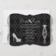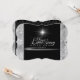 Une Histoire D'Amour Ne Met Jamais Fin Au Thème Mariage De Cravate Noire. Style diamant brillant avec cadres en satin blanc "A Love Story Never End" typographie. Invitation posée sur un arrière - plan en velours de diamant noir avec cadre satiné. Bouton en verre diamant avec noeud d'amour rubis, emblème et cravate diamant assortie.