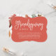 Invitez vos amis à votre version du dîner de Thanksgiving avec ces invitations élégantes ! Un fond de couleur terre cuite riche présente une typographie moderne manuscrite blanche. Le verso de l'invitation de Thanksgiving présente un beau motif de feuilles d'automne.