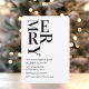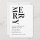 Faites une déclaration audacieuse en cette période de fêtes avec cette invitation minimaliste à dîner de Noël. Avec une typographie noire frappante orthographiée MERRY dans un design vertical moderne, ce design épuré et sophistiqué est parfait pour ceux qui aiment un style de vacances élégant et contemporain. Idéale pour les dîners de Noël, les fêtes de fin d'année ou les fêtes festives, cette invitation unique allie simplicité et élégance. Customisez avec vos propres détails d'événement pour une carte de célébration de vacances élégante.