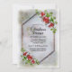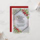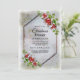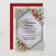 Une élégante invitation à la fête de Noël avec une bordure géométrique et des fleurs rouges.