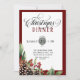 Script Noël Dîner Invitation. Noël est un élément de conception de script et le cadre de date circulaire ont deux teintes vertes du côté arrière En vichy motif. Les formes rendent cette invitation organique et fluide. Un cadre rouge bordeaux profond et une aquarelle décorée de baies sèches, de verdure et de cônes de pin dans le coin inférieur. Le dos a un motif en vichy vert. Gardez vivante votre tradition de dîner de Noël et impressionnez la famille et les invités avec ces éléments. Voir les autres produits correspondants de cette collection pour un thème cohésif.