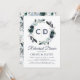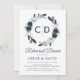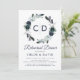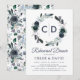 Cartes d'invitation de dîner de répétition de mariage élégantes avec un fond blanc chic qui peut être changé en n'importe quelle couleur, une couronne florale aquarelle bleue marine rustique, les initiales des conjoints et un modèle de texte moderne facile à personnaliser.