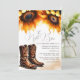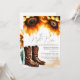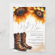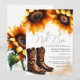 Ces invitations pour le dîner de répétition combinent le charme rustique avec des détails aquarelles peints à la main pour les couples qui prévoient une célébration chaleureuse et accueillante. Conçue avec une atmosphère romantique champêtre, cette invitation présente la phrase « La veille » en calligraphie élégante, encadrée par une belle bordure supérieure de fleurs d'aquarelle de tournesol et de bottes de cowboy classiques de couleur jaune doré riche et de tons bruns chauds. Le verso continue le thème coordonné de fleurs de tournesol pour un look cohérent et soigné.