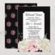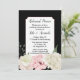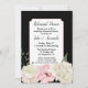 Invitation élégante pour le dîner de répétition de mariage réalisée en noir, avec une zone de texte blanche et des accents roses. De superbes graphismes de fleurs blanches et roses ornent le bas de l'invitation. Personnalisez le texte noir pour votre événement de mariage.