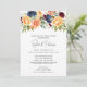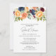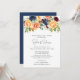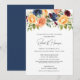 Cette superbe invitation au dîner de répétition présente une luxuriante composition florale à l'aquarelle de roses jaune doré, de fleurs écloses pêche, de pivoines bleu marine et de fleurs bordeaux profond qui cascades sur le dessus. La typographie moderne et épurée se marie parfaitement avec le riche bouquet aux tons de joyaux sur un fond blanc croquant, avec un dos bleu marine coordonné. Tout le texte est entièrement personnalisable pour s'adapter aux détails de votre événement. Un choix parfait pour un dîner de répétition de mariage d'automne.