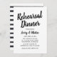 Ces invitations à dîner minimes et élégantes pour les répétitions de mariage sont dotées d'un titre de script brossé à la main noir et d'un motif de bandes horizontales noires et blanches à l'arrière de la carte. Le texte personnalisé moderne peut être entièrement personnalisé pour votre événement spécial.
