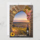 Dîner de répétition romantique avec un thème de vin avec une arche en pierre antique avec une lanterne, des raisins et du tournesol et sur le dos une peinture d'un coucher de soleil sur un vignoble avec bouteille de vin et des verres.