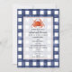 Un dîner de répétition mariage avec un design de en vichy bleu patiné devant et derrière. Caractéristiques avant illustrant un crabe. Personnalisez le texte noir.